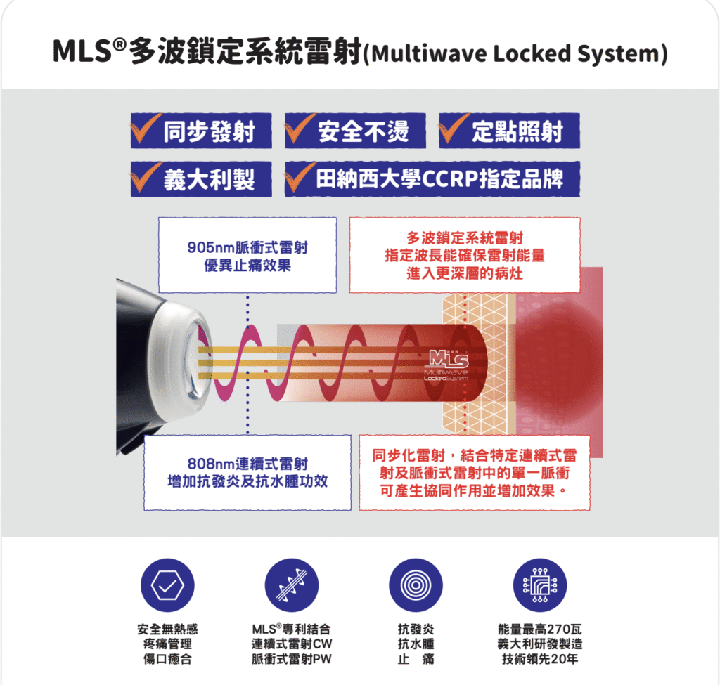 此治療以高能量光線刺激細胞活性,藉由光生物調節作用(Photobiomodulation)**促進組織修復、減少發炎反應並緩解疼痛,