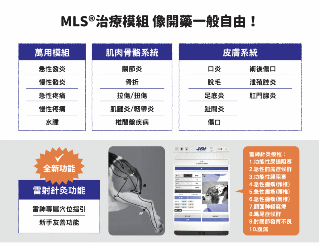 • 🪡 針灸治療:針灸與雷射皆能調節神經傳導與促進循環,兩者並用可強化鎮痛與抗發炎效果。