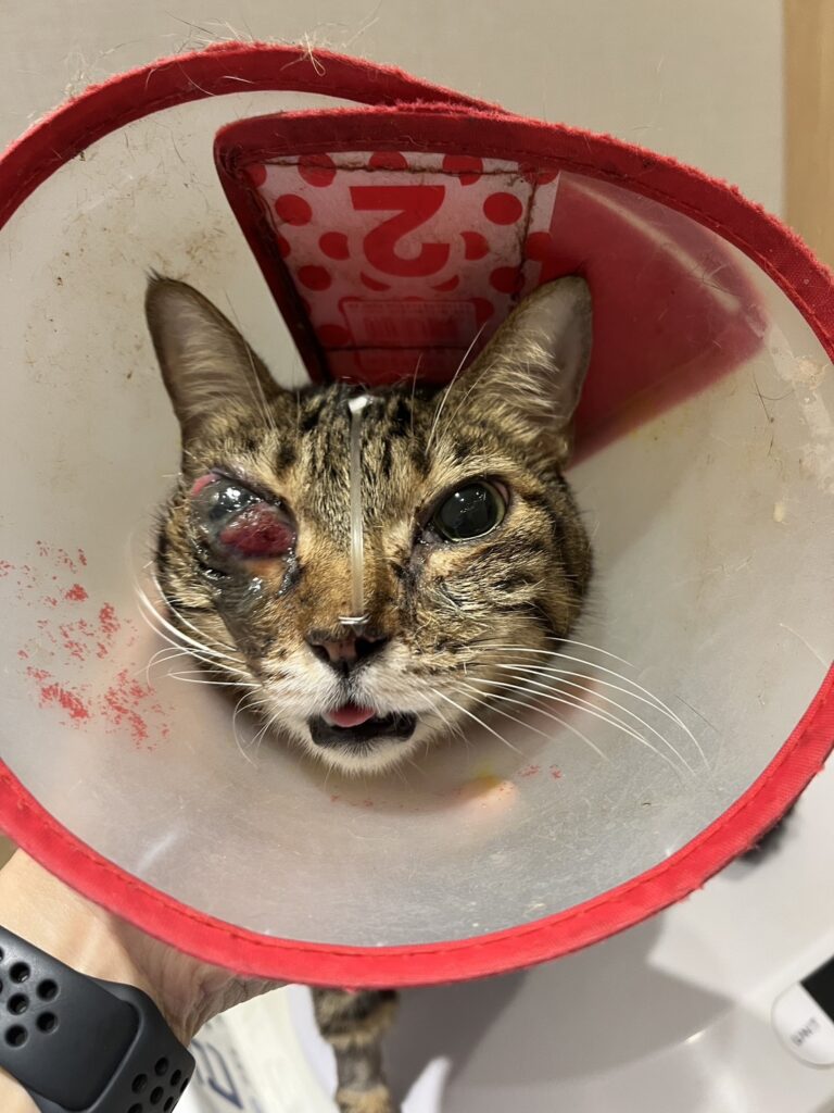 從11月開始打噴嚏流鼻水,接著開始鼻塞,呼吸發出阻塞的聲音,飼主也果斷進行斷層掃描,發現鼻腔與額竇被軟組織團塊佔據、擠壓,過沒幾週,原本貪吃的貓咪,因為臉部組織、眼睛被腫瘤擠壓,開始沒有胃口,甚至可以看到眼睛被推擠得無法閉合,感覺相當痛苦