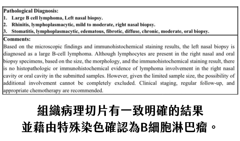 於是我們安排了鼻腔鏡採樣,除了微生物檢驗與病理切片外,透過當下的抹片檢查,發現有許多大淋巴球的細胞,因此判斷為淋巴腫瘤機率大增,後續病理的結果也支持此一判斷。