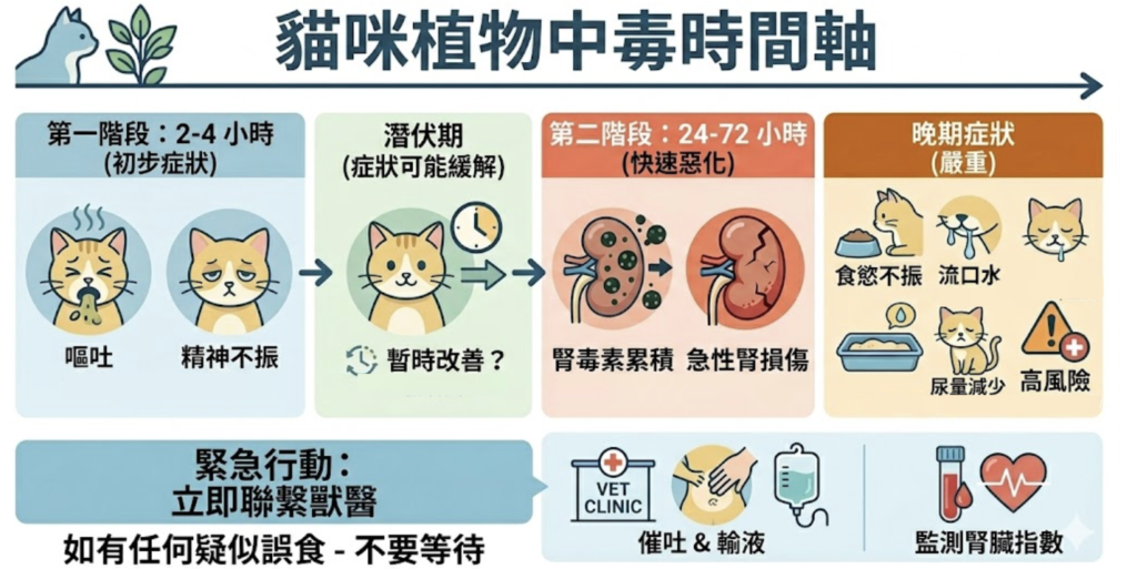 在食入之後2-4小時內貓就可能發生精神沉鬱並開始嘔吐,此時很容易跟一般植物中毒搞混,若家中有相似的植物請務必提高警覺一定要告知獸醫師!